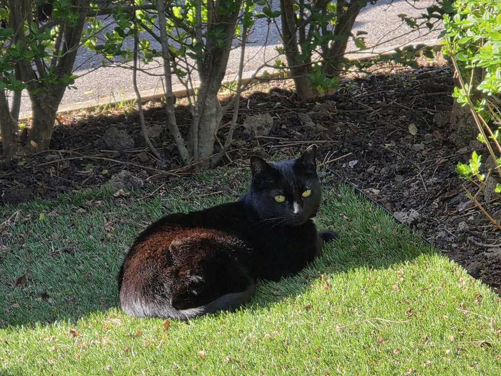 We got home to find one of our neighbours’ cats sitting in a sunbeam on our front lawn. She doesn’t care about oil prices. They have two cats – Musetta & Mimi – named after girls in Giacomo Puccini’s opera, La Bohème. This is Musetta. She is feisty.