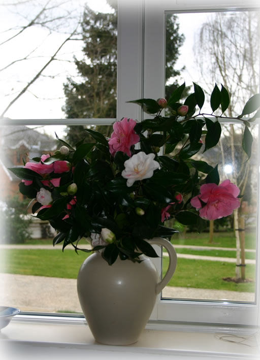 Our grounds were those of a Nineteenth Century Convent. All the planting is from the brooding, peaceful past. Deep in our wooded surrounds, huge Camellia trees are blossoming profusely but out of sight. Ever the intrepid explorer, I waded in with secateurs and brought back a bounty of pink and white blooms. Pauline trimmed them up and arranged them beautifully.