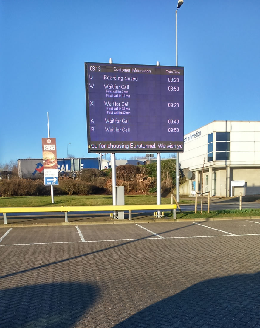 Beautiful, clear day at 6.30 this morning as we drove out of the garage and down to the Channel Tunnel. How light it is now at this time in the morning. By 7.00 am, the cloudless blue sky was illuminated by strong sunshine. We were at the check-in well in time for a coffee, passport control and lining up to go. We were Letter W for the crossing. At 8.12 am we saw this notice: