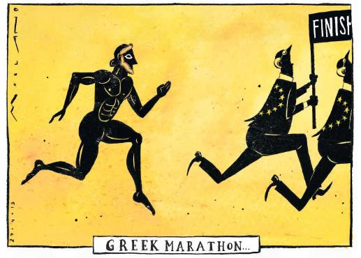 Don’t say I didn’t warn you. Be very careful if you go to Greece this year. Don’t pay up front for anything. Don’t put money in a Greek bank account. Don’t forward pay hoteliers. There is a real risk of default and you losing all your money. We have been so lucky to get out in time. This week, panic set in across the country as pensioners feared not being paid, raided their bank accounts and risked a run on the banks’ reserves. The coalition government are scrabbling around to find the cash and trying to call it in from the country’s institutions and local government. They are constantly running to keep up and losing the race, as The Times cartoon pointed out yesterday: