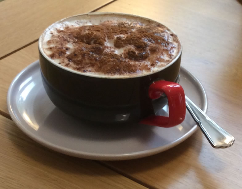 It grinds the beans, forces pressurised hot water through the newly made grounds and produces a lovely head on the coffee. The Italians would probably call me a philistine because I needed frothed milk on the top. Over the frothed head, I sprinkle cinnamon and then chocolate powder.