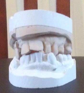 ……….. a lovely swim, Jacuzzi and sauna and then on to the dentist. It takes him ten minutes to fit the crown and me two minutes to pay the money. Actually, he has done a good job and I am satisfied. As I am leaving, he remembers to wish us ‘happy holiday’ and good luck with our house move. He also hands me the plaster cast made of my teeth which he said I could keep as a memento. They are hideous and will go in the bin tomorrow.