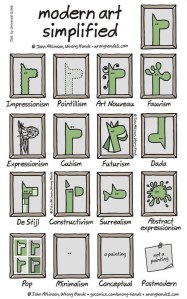 As forecast, we woke to thick and freezing fog with a temperature of -4C/25F. It was slow to lift and, when we left for the Health Club at 1.00 pm, the temperature had only reached 3C/37F. It is said to be getting warmer towards the weekend. Before I continue, I’d like to share a lovely and humorous chart of Modern Art Explained that I found on Twitter.