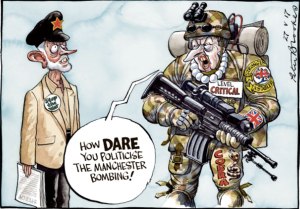 The Labour Party have been soundly condemned for advancing views about Terrorism, its causes and prevention in the course of fighting the election. The Tories, meanwhile, have done exactly that in the guise of ‘strong government’. Polls this weekend show the Tory lead cut from 25% at the outset to just 6% now. Although this may be illusory, transitory or a ‘blip’, the Tories are wobbling. The Times cartoon today encapsulates this position neatly.