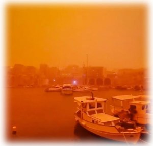 Talking about Greece, the news today is of Greece turning orange. Strange? Well, it sems that the atmosphere has picked up, carried and dumped tons of red, Saharan sand mixed with wind and rain across the Mediterranean particularly across the Greek islands. This photo is not shot with a filter but an unreconstructed view of a Cretan harbour. We had something similar but less dramatic here last year.