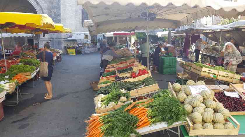 Although we were there and parked well before 9.00 am, the market was already busy and vibrant. We walked through the first street and said to each other, “We’ll have some of those and … those and those. The most wonderful and interestingly huge tomatoes – red, orange, yellow, purple – maybe about ten, different types. Shallots, garlic and onions in the green, newly pulled stage. A little, old lady was selling her own eggs from her small holding and had pictures of her hens. I asked their names but she didn’t understand. Even so, we bought half a dozen. We also bought local strawberries (gorgeously sweet) and raspberries, pickled garlic and delicious, green olives.