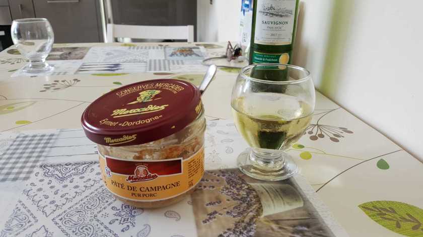 Another really enjoyable day. Humid and ‘close’ but inconsistently sunny. We did our weekend shop but indulged ourselves with walks around Carrefour, Netto and Intermarche. We also looked round Brico (B&Q equivalent) which had house and garden hardware. Recently, we visited the market in Eymet. Today, as we walked round Netto, we noticed a jar of simple pâté de campagne made by 4th generation family producers in Eymet. That became our lunch and it was absolutely delicious.