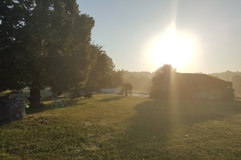 Up at 6.00 am to watch the sunrise out of the early morning mist around our gite. The long grass has nets of mist/condensation blanketing it but soon to be burnt off. We are going out to (another) medieval village/town. This time we will visit Monpazier about 40 mins drive away. Of course we have to be back for 4.00 pm for a particular event.