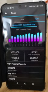 I started this Garmin App. for my new Garmin smartwatch in the middle of October last year. In spite of that, today, I reached a daily average paces for the past twelve months of 10,008.6 paces from a total of 3,613,156 paces for the year which equates to walking 1,874.2 miles in the year. Obviously, with 2 weeks still to go, I can improve on this and I motivated to do just that. Don’t ask me why.