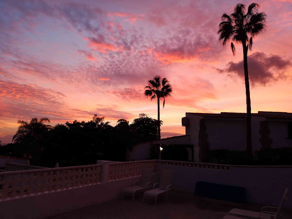 One of those typical, Canarian mornings that opened with sunrise behind a huge bank of ominous cloud. Breakfast, download of newspapers, prepare for first swim and the sky is blue, the sun is up. There is not a single cloud in sight. We started the first part of our 27th hour of swimming in 27 days. Completed second half this afternoon. Just three days and three hours left before return to Sussex.