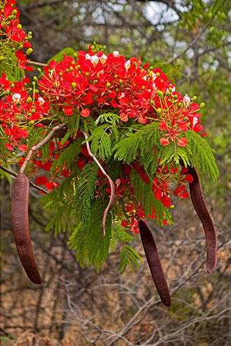 I’ve also got a chance now to use something I brought back from Tenerife at the end of November last year. A tree with red flowers and long, green, sheath-like pods which turn hard brown on maturity lined the streets where we had a villa. I picked a couple of pods and put them in our luggage. Today, I took the pod down from the bookshelves in the Office and looked up for the first time what the tree is called. Its name is officially Delonix Regia which is more commonly referred to as The Flamboyant Tree or Flame Tree.