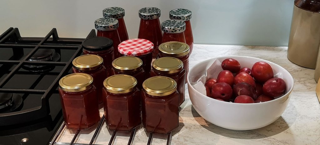 Strange to see a damp, dark day but that’s what we’ve got today. Pauline was engaged in her final preserves of the year – Victoria Plum Jam. We have both loved Victoria Plums for years but usually the time when they are available has coincided with us being abroad. Last year we picked our own from the orchards round the corner from our house. This year we’ve just bought them from the glut hitting the shops.