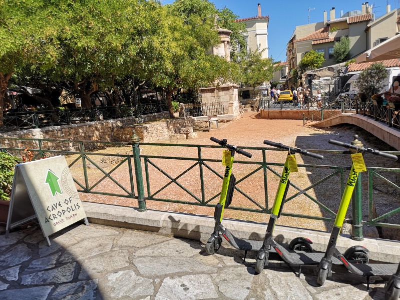 One of the noticeable innovations in Athens this year is the proliferation of electric scooters. They can be picked up anywhere, paid for by credit card and dumped anywhere when you’ve finished with them.