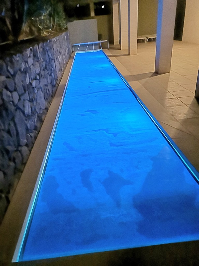 Our pool is exactly right for us. We don’t want some plunge pool to cool off or a playing pool for families with children. We want a swimming pool so we can do ….swimming. This pool is ideal. It is 16m x 2.5m / 52ft x 8ft. Even in the lovely, warm weather here, the water in a pool can feel quite chilly to get in to. Our pool is heated all day/night to a deliciously warm temperature. The owners usually charge for this but gave it to us ‘free’ because we were renting for a month. They have also clearly heard that I stumbled into the pool in the evening darkness at last year’s property because they have automatic lights fitted for all round illumination. Although we don’t need to, we make a practice of covering the pool after every swim in order to cut down the cost of maintaining the temperature.