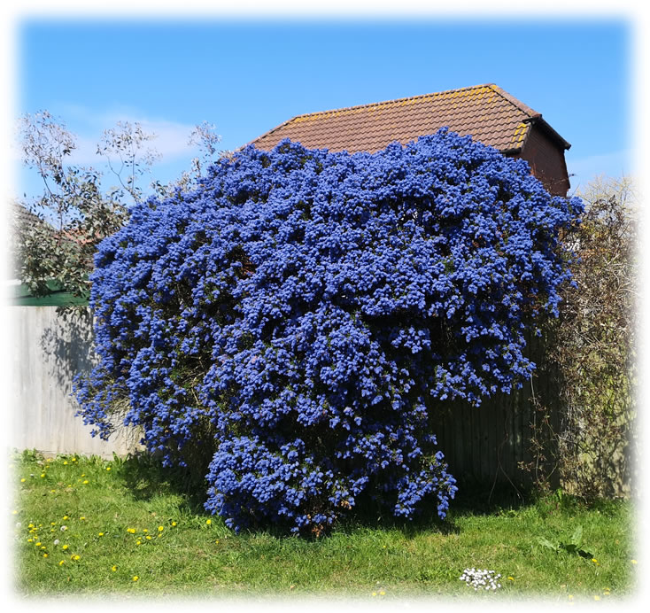 There are some plants and herbaceous bushes that do particularly well down here in the warmth and additional sunshine of the south coast. Blue is quite a rare colour to find in plants and the Ceanothus provides it in profusion. It does so well here. This example was flowering strongly on the outside of a garden that we passed on our walk today. “Ceonothus” comes from a Greek word meaning “spiny plant” – keanōthos – although the genus is native to North America.