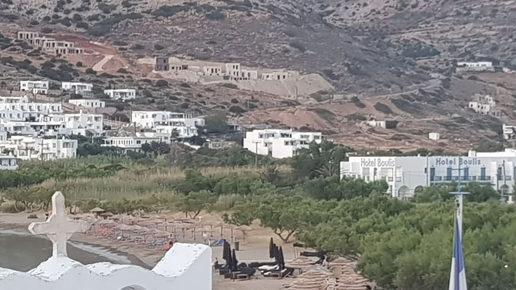 The house we designed, had built and lived in on Sifnos for 10 years is the long, white streak in the top, right hand corner. The land on the mountain side lower down the road towards the port has laid bare for millennia. Now, slowly and quietly, development is taking place on the ‘hot’, ‘English’ side of the bay. Shows optimism at least. Look forward to seeing the completed buildings next year.