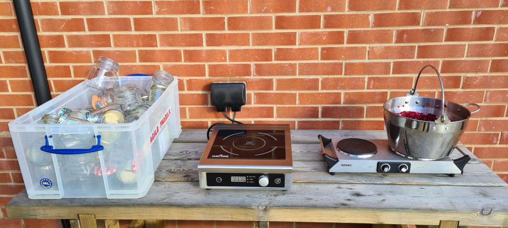 Although she rarely accepts it, Pauline is a genius in the kitchen. We rarely eat a disappointing or unhealthy meal. Every ingredient is carefully sourced for quality and price. In comparison, eating out in restaurants is so disappointingly second class that we just don’t do it. This weekend is making new batches of Beetroot Chutney, Tomato Chutney and Strawberry Jam. The chutneys are cooked out on the garden kitchen table to avoid the all-pervasive smell of warm vinegar which would linger in the house.