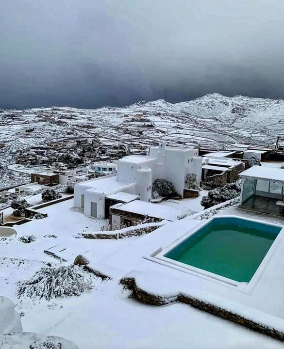 While we are having a gentle, mild Winter, Greece is being hit by real weather. Today, even the Cyclades has been covered in snow. This is Mykonos but nearby Sifnos has experienced it as well. Unlike us, they will be celebrating the unusual event with fascination and joy.