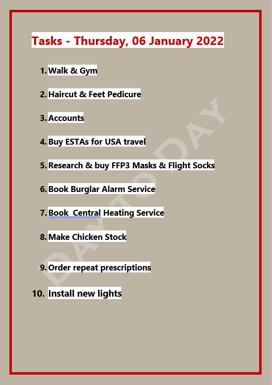 A dull, relatively mild day. Some say it’s Sunday but I wouldn’t know. Apart from exercise, we are expecting two, new chairs for the conservatory windows to be delivered by the ubiquitous DPD. An hour and a half walking and the same again in the Gym.