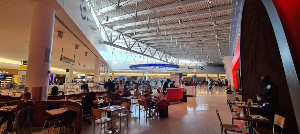Actually, the shuttle driver turned out to be a mad ’hippy’ who thought he was a comedian. His driving certainly suited him to it. Anyway, we were at JFK airport, Terminal 5 (internal flights) by 12.oo pm with 2hrs before our flight ….. except, once again, it wasn’t. As we dropped off our bags and went ’airside’, my JetBlue app messaged me with a 50 mins delay. We decided to have a drink at one of the many outlets in this one of 8 different vast terminals. As we sat down, my app informed me of a second delay of an hour +and we now know that we will be more than 3 hrs late.