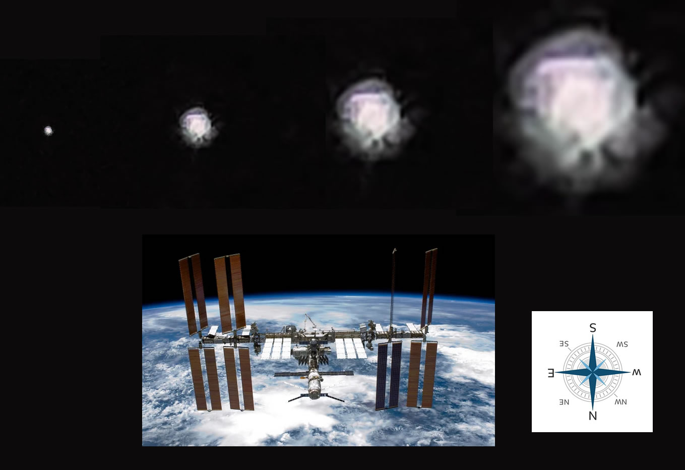 Last night I was too lazy to go outside even though it was very warm. I took photos with my phone through the window glass – not the best method – at actual size and 100x zoom and then increased twice again on my computer. You can see the square inner shape created by the solar panels which generate the power to maintain it. Apparently, even though it shone incredibly brightly in the night sky, it was high enough to still catch the sun’s rays.