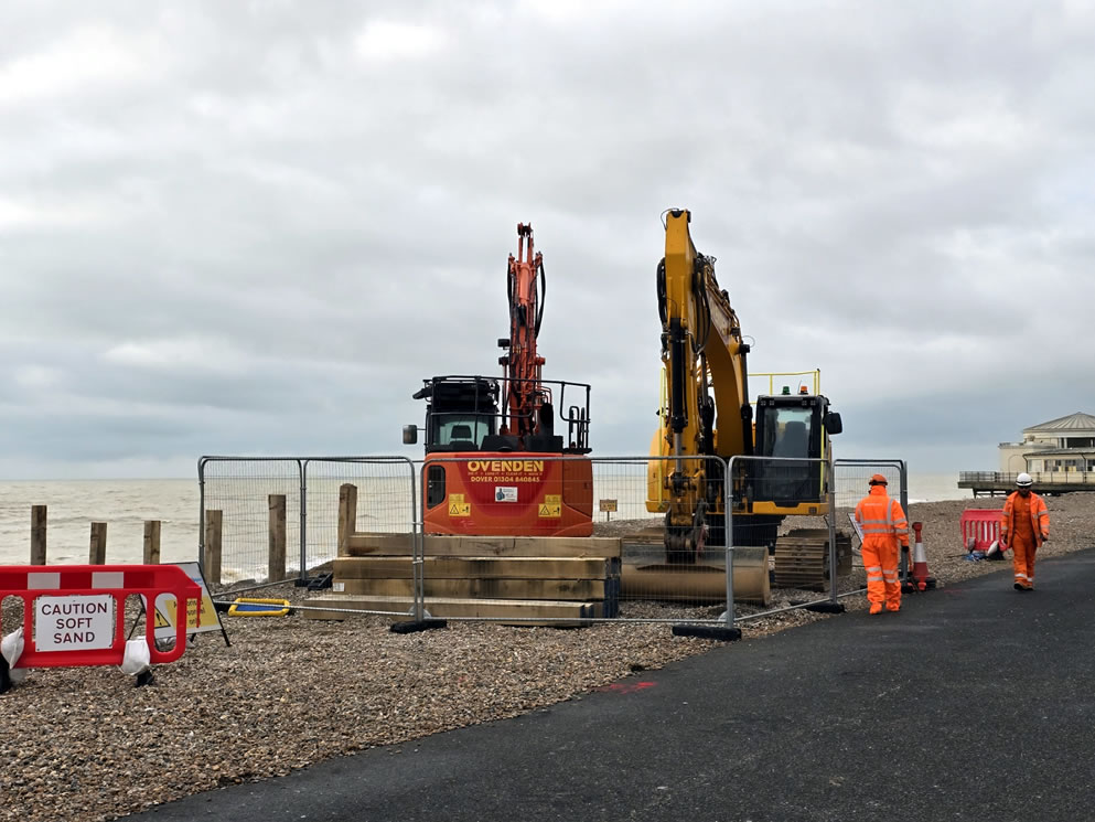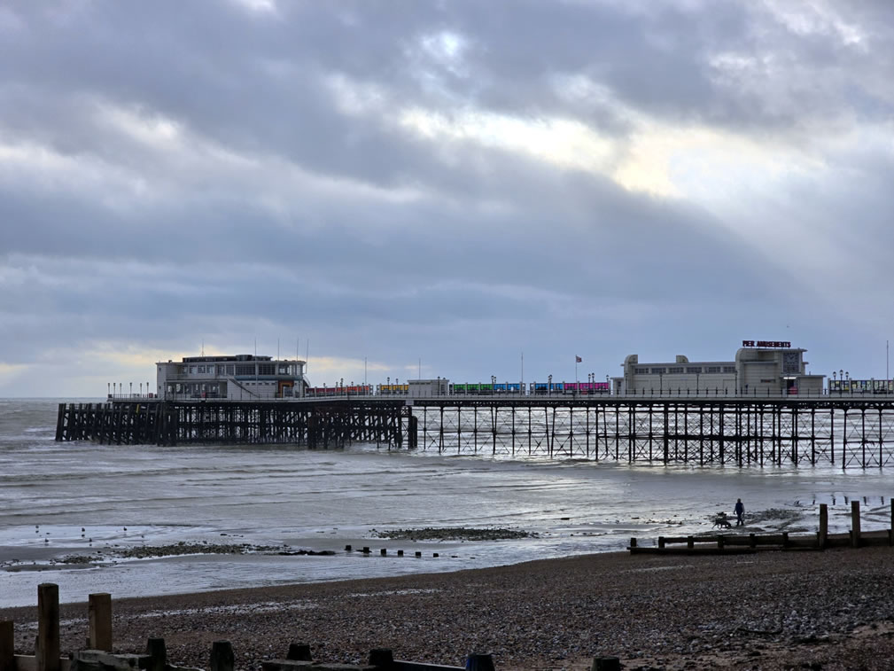 Just back from the delights of M&S opposite the Worthing Pier. Workmen are renewing the groynes on the beach. Gorgeous, huge hunks of wood being driven into the shale to form a barrier slowing down the onslaught of the waves. I spoke to the men. They told me that these massive oak logs would last around 15 years of twice daily salt water beating.