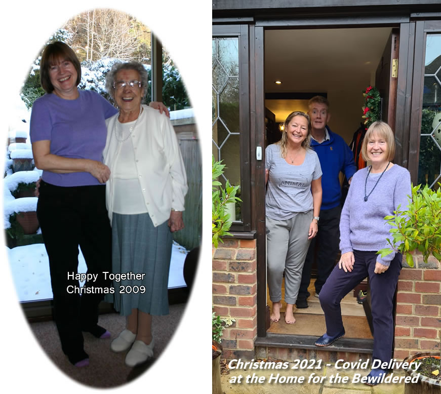 Pauline’s last Christmas with her Mum was a wonderful one and then 12 years on, instead of cooking for them on the day as usual, during Covid restrictions we drove up to The Surrey Home for the Bewildered where staff had got a couple of inmates up and dressed in time to receive and look grateful for their pre-prepared Christmas feast.
