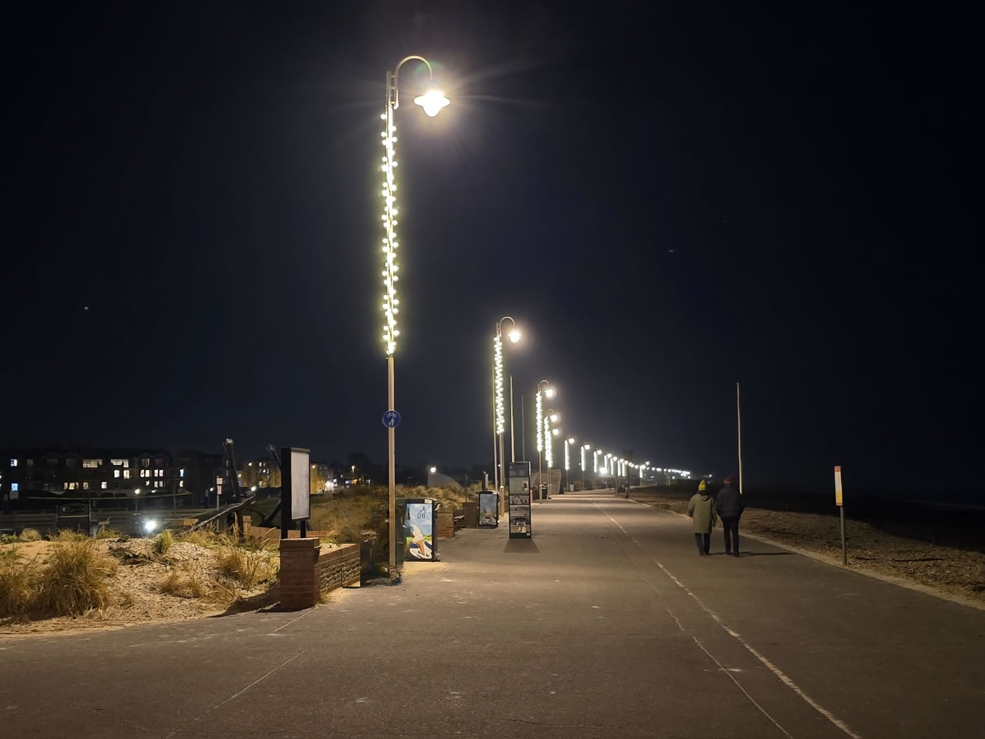 Twenty years on, I walked down the beach road last night and, in spite of the lights, it was cold and equally bleak. Almost no lights out at sea as I stared into the inky blackness. Maybe a bit warmer than the Pennine Moors. To the right is the endlessly undulating sea. To the left is the newly developed and brightly lit enchanted parkland path leading to old and fading civilisation.