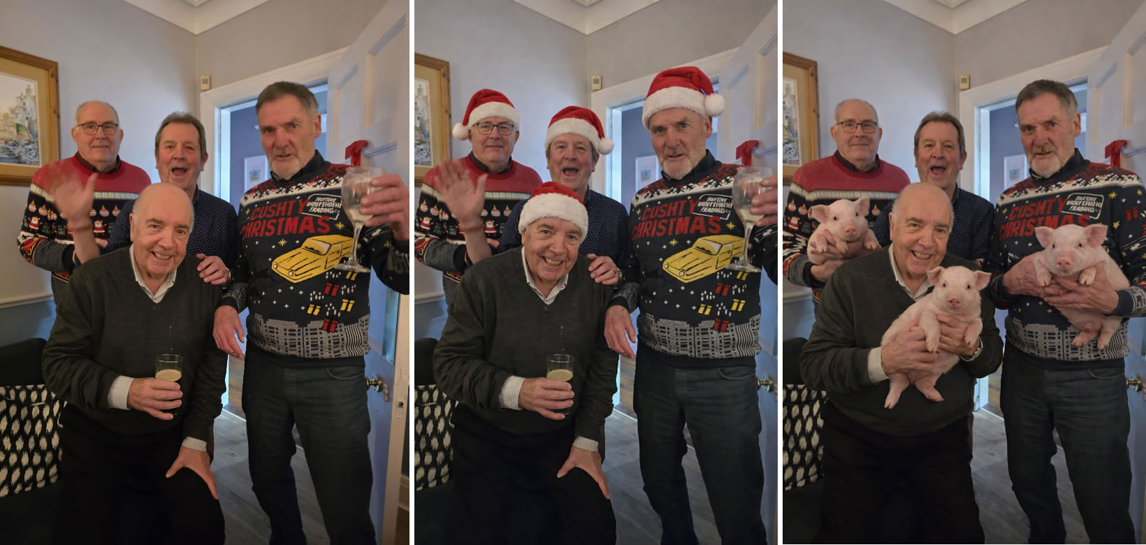 As a retired old Blogger, my use for AI is much less urgent. So many people want words because they find them so difficult. I don’t. In fact my hackles rise when AI suggests improvements to my writing. I particularly want help with graphics. Above are three versions of the same photo. The one on left is the original. In the middle one, ChatGTP added Santa Hats and on the right Baby Piglets were the presents. The problem is that it is all so effortless.